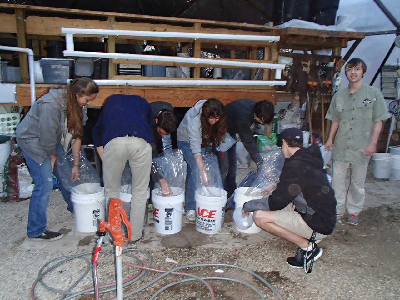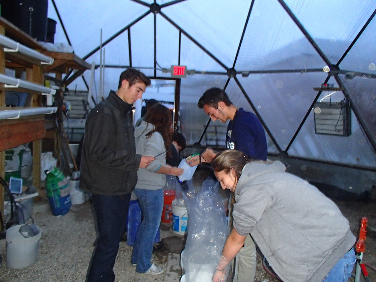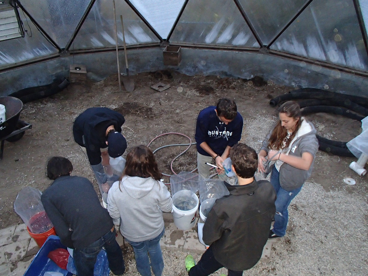 Every year a team of Sustainability students (photo credit Ian McGurn) at GTA devotes some time to acclimate catfish fingerlings to their new home in our greenhouse. With this much help it takes no time at all to transition the fish from their cooler starting pond to the balmy conditions in the greenhouse.